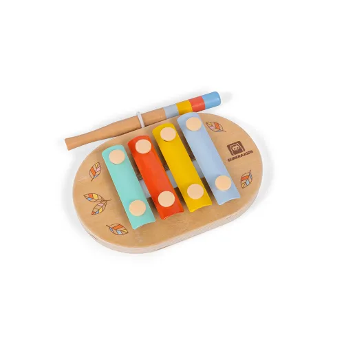 Denna lilla och mångsidiga träxylofon är det perfekta instrumentet för dem att upptäcka musik genom slagverk. Genom att slå på de olika tangenterna med klubban kommer de att upptäcka att varje tangent avger ett annorlunda ljud och att de, genom att slå på dem kontinuerligt, kan skapa enkla melodier. Denna har 4 tangenter, och varje tangent har en annan färg för att göra dem lättare att identifiera. Och en reducerad storlek så att de kan ta den med sig överallt.