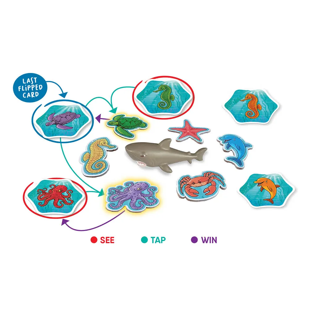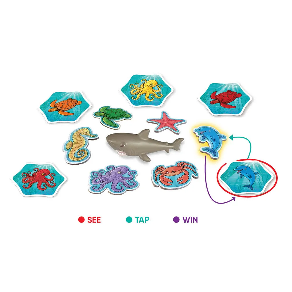 Öka din anpassningsförmåga. Innehåll: 72 spelkort, 12 haj-kort, 6 marina djur-marker, 1 haj, 1 instruktioner.