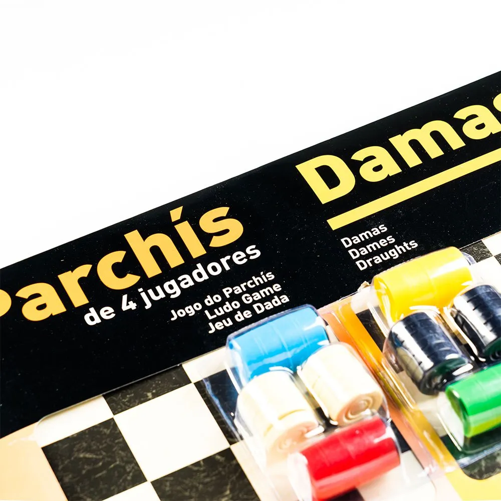Inkluderar färgade spelpjäser och tärningar för Fia med knuff och svarta och vita pjäser för schack.
