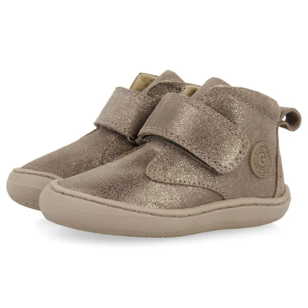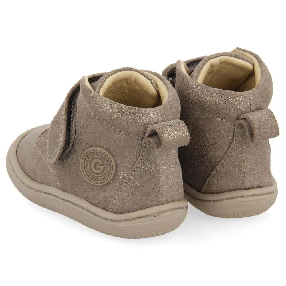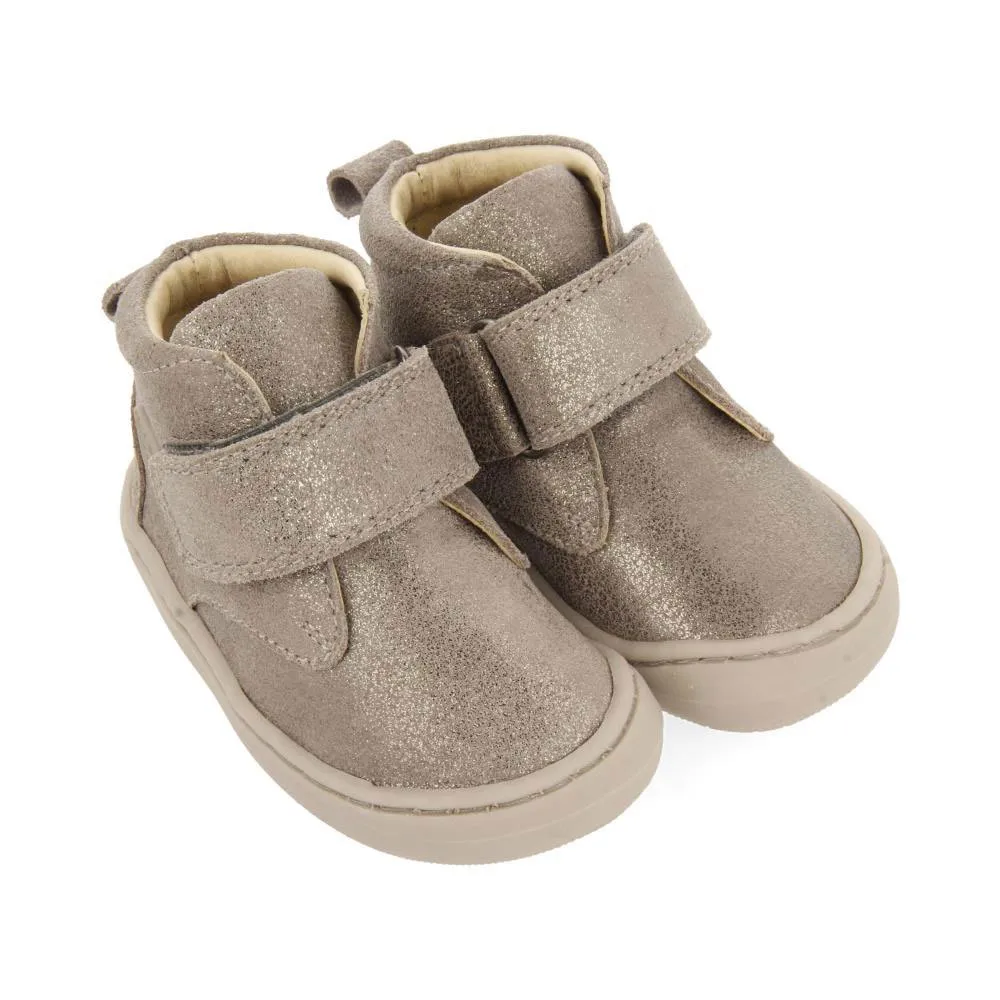 Grå ankelboots med glitter och justerbara stängningar utan anatomiska element som kan hindra fotens optimala utveckling.