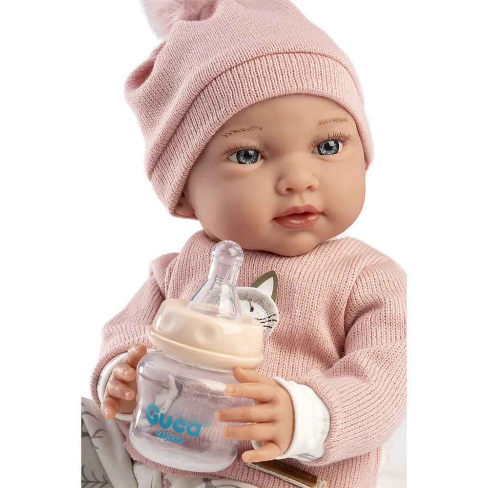 Hon är klädd i en beige stickad benvärmare med barnteckningar i grått och rosa, en långärmad rosa ylletröja med en liten djurprydnad på bröstet.