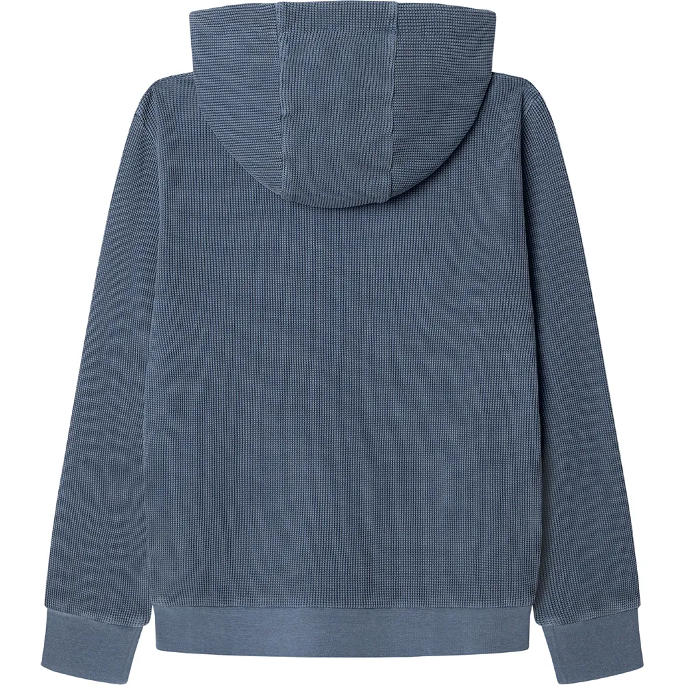 Det utmärkande draget hos denna hoodie är dess unika våffelstruktur. Denna intrikata, tredimensionella stickning ger inte bara en modern och visuellt tilltalande finish utan ökar också komforten genom att skapa små luftfickor som erbjuder lätt isolering utan att vara klumpig. Det är en modern tolkning av ett klassiskt tyg, vilket säkerställer att han ser skarp ut samtidigt som han känner sig helt bekväm.