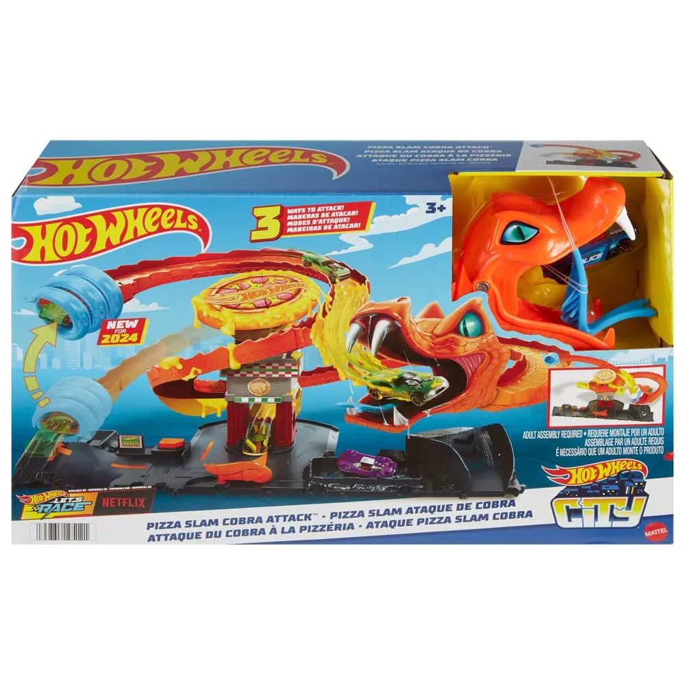 Gör dig redo för högoktanig action med HOT WHEELS City Ormattack-leksetet! En massiv, motoriserad orm har ringlat sig runt ett garage i flera våningar, redo att slå till. Använd avfyrningsrampen för att skicka din Hot Wheels-bil (1 ingår) susande genom den förrädiska stadsmiljön. Precision och tajming är allt! Kan du susa förbi de hotfulla huggtänderna och undkomma dess slingrande grepp, eller kommer din bil att fångas? Detta spännande lekset för åldrarna 4-8 år utvecklar problemlösningsförmåga och ger bränsle till timmar av fantasifullt berättande. Anslut till andra Hot Wheels City-set för att bygga en episk äventyrsvärld