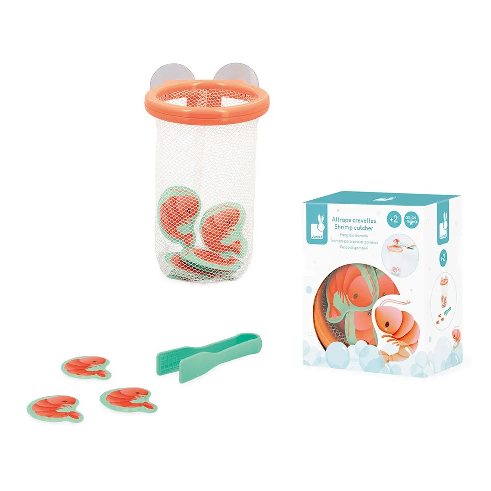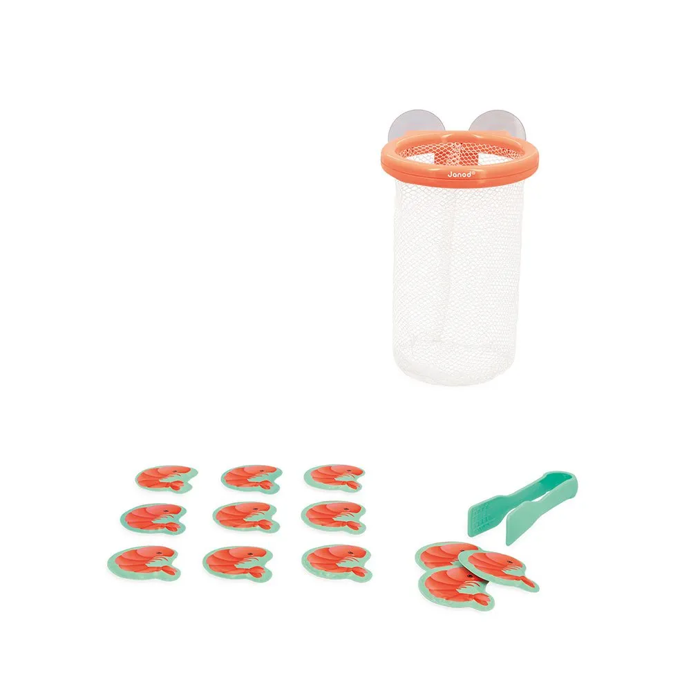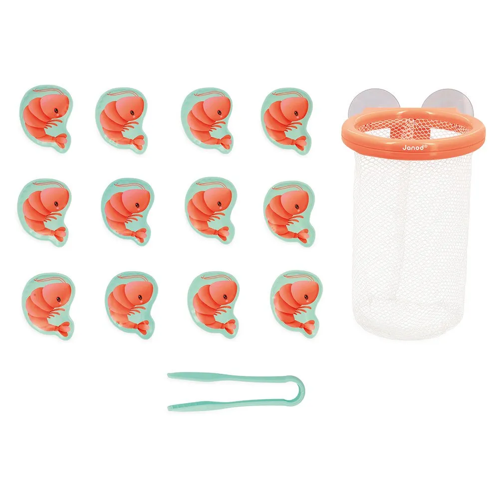 12 små räkor har rymt in i badet, du måste fånga dem snabbt! Med tången kan ditt barn fånga varje räka som flyter på vattenytan och lägga dem i en fin korg som fästs på kakelplattorna med sugproppar.