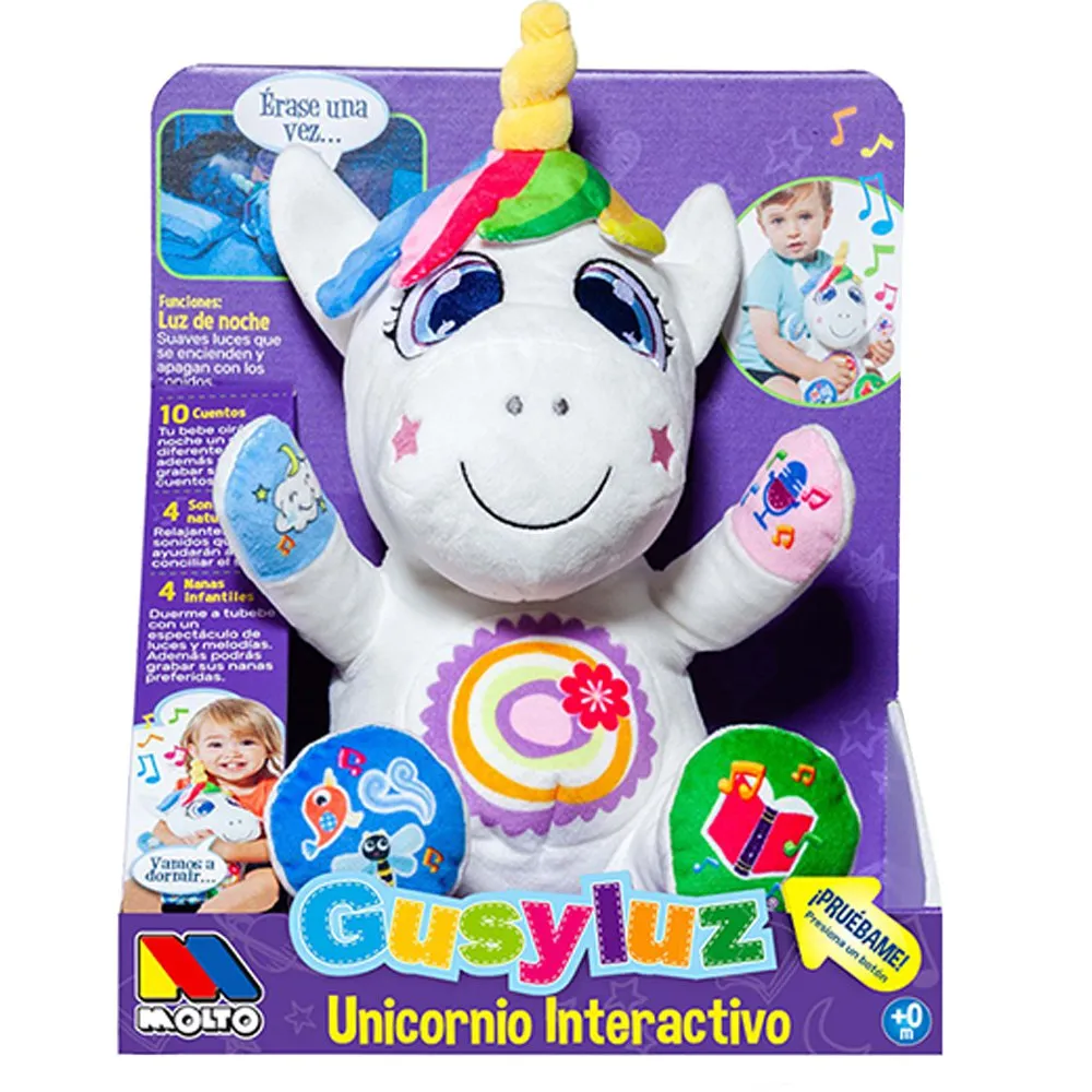 Denna plyschenhörning är tillverkad för att vara den perfekta kramkompisen och är otroligt mjuk att röra vid, vilket gör den idealisk för att gosa med. Dess vänliga ansikte och magiska design kommer snabbt att göra den till ditt barns mest älskade vän, en pålitlig källa till tröst under både lek och tupplur. MOLTO Unicorn Gusyluz Interaktiv är den ultimata multifunktionella mjukleksaken, som skickligt kombinerar den tröstande tryggheten hos en plyschvän, den milda lugnande effekten av en nattlampa och den lugnande kraften i berättelser och ljud för att skapa den perfekta sovmiljön för din dyrbara lilla
