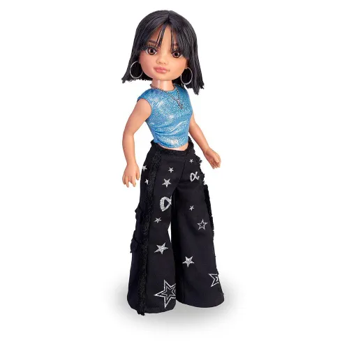 Gör dig redo att glänsa i stil! Outfiten inkluderar en bländande blå topp, vida svarta byxor prydda med fransar och silverstjärnor, och de mest snygga svarta stövlarna, precis som Aitana.