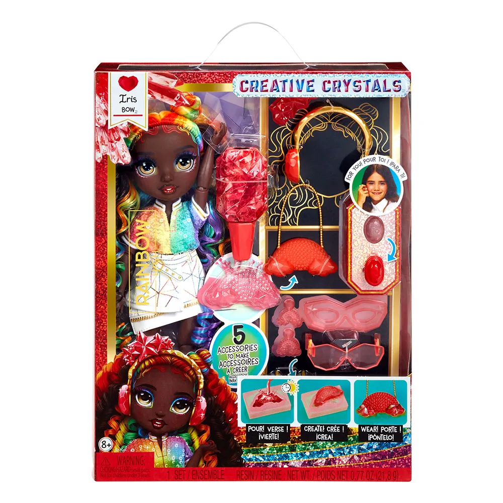 Rainbow High Creative Crystals-modellen Iris Bow kommer med allt du behöver för att göra 5 DIY-kristallmodeaccessoarer! Gör solglasögon, örhängen, handväska och ett pannband med kristalltillbehör till din docka.