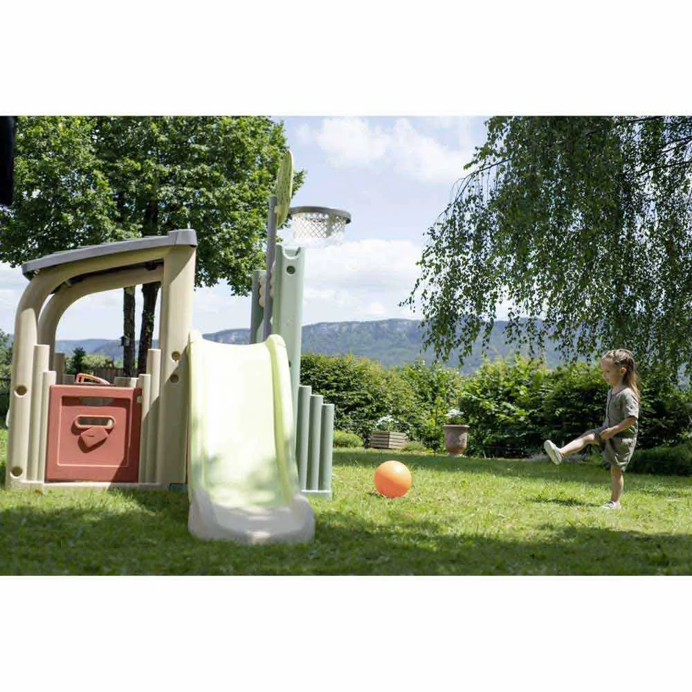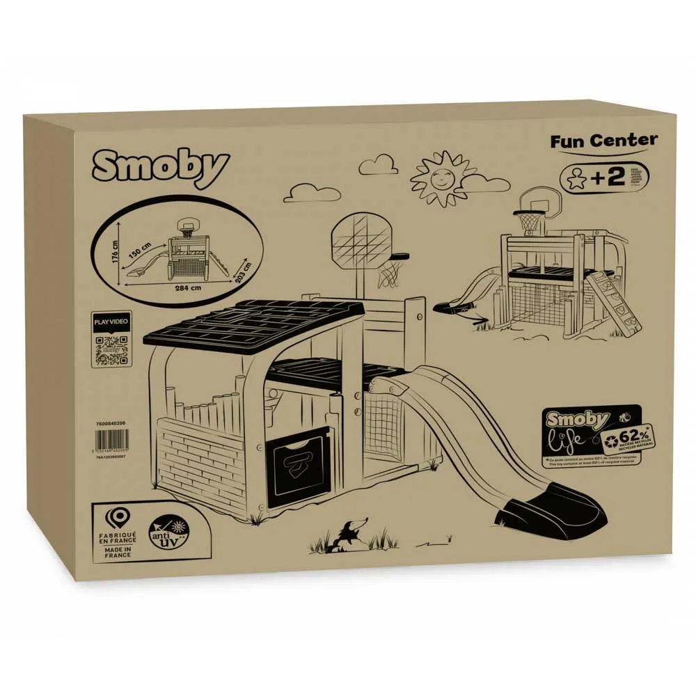 Smoby Life Fun Center, tillverkat av minst 60 % återvunnen plast, erbjuder många lek- och sportmöjligheter. Den täckta lekhusdelen med en halvdörr ger gott om plats för vänner och syskon att ha roligt. En mångsidig sportyta gör Fun Center till en favoritplats, oavsett om det är i trädgården eller i barnrummet. Med den robusta, färgglada rutschkanan, ett fotbollsmål med nät och en basketkorg kommer barnen att ha massor av kul. Klätterväggen kan roteras och användas som stege. Rutschkanan är 150 cm lång och slutar i en bred rutschbaneutgång som säkerställer mjuka landningar. En speciell höjdpunkt för varma sommardagar: rutschkanan kan enkelt förvandlas till en vattenrutschkana. Fäst helt enkelt en vanlig trädgårdsslang (ingår ej) på undersidan av rutschkanan, och vattenleken kan börja. Smoby Fun Center är tillverkat av högkvalitativ, UV-stabil plast och är därför särskilt motståndskraftigt mot väderpåverkan och blekning.
