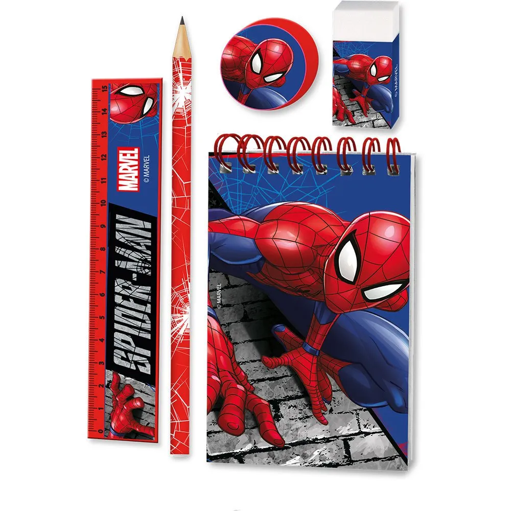 Setet innehåller en rad skrivtillbehör som pennor, suddgummin, pennvässare och en linjal, alla prydda med djärva och färgglada Spiderman-grafik. Varje del är utformad för att fånga essensen av den älskade superhjälten, med Spidermans ikoniska mask, spindeldesign och livfulla färger.