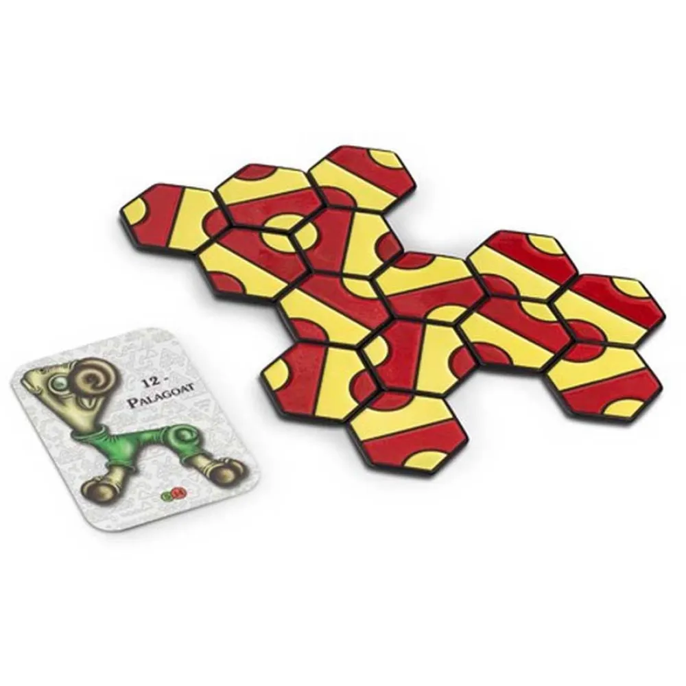 De 14 brickorna i Palapuzzle-spelet, hexagonformade och med en unik design, inbjuder både barn och vuxna att designa och utveckla figurer, djur och kreativa former.
