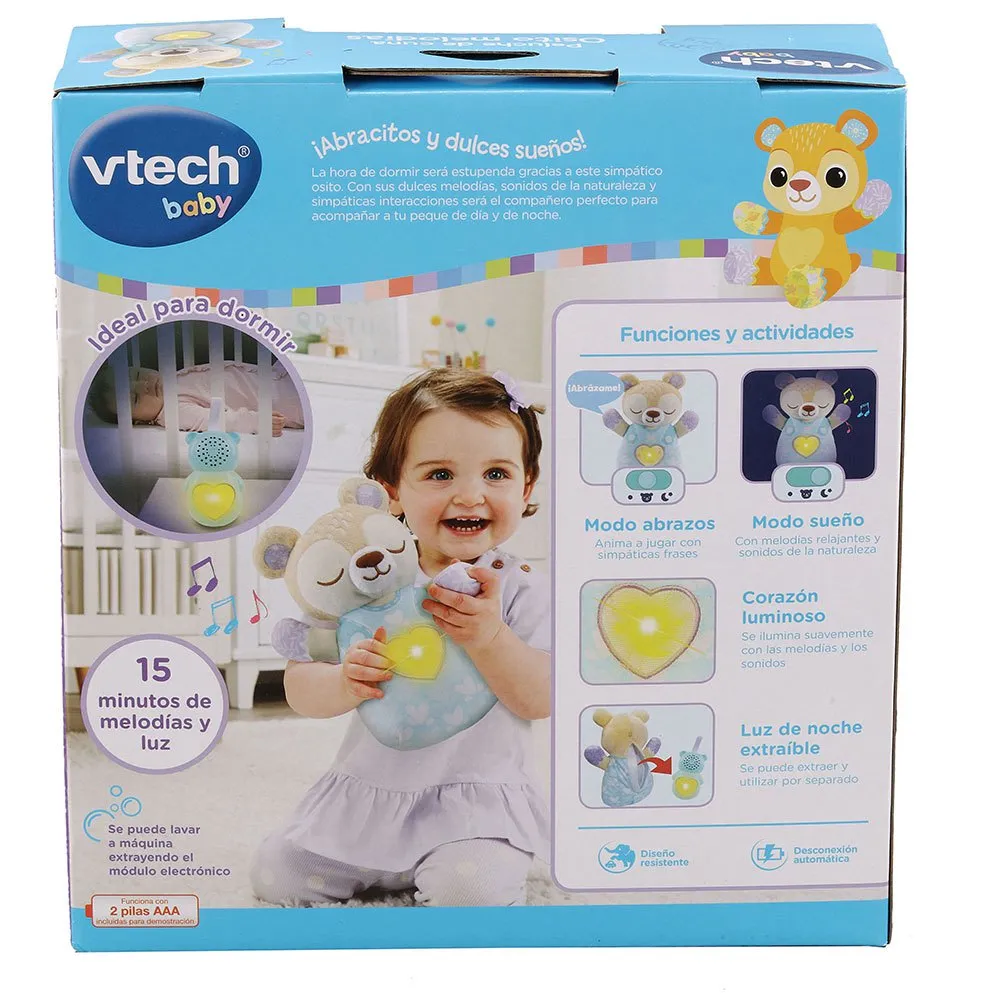 Introducera VTechs Peluche de cuna Osito melodías! Denna mjuka och gosiga on the go-björn är perfekt för mys och kramar.