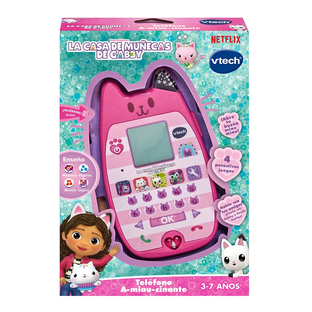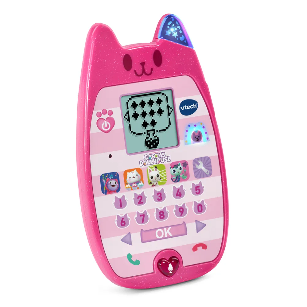 Gör dig redo att chatta med Gabby och Pandy Paws på deras a-mjau-sande interaktiva telefon! Denna förskoletleksak gör lärandet roligt med fyra spännande spel som lär ut siffror, räkning, former och mer. Hjälp Cakey Cat att dekorera en tårta, testa ditt minne med Pandy, och använd mikrofonen för att få DJ Catnip att dansa! Tack vare röstaktivering kan du ha riktiga konversationer med Gabby. Kolla Meow Meow-brevlådan för röstmeddelanden och titta på söta karaktärsanimationer på skärmen. Anpassa din telefon med unika ringsignaler för oändlig fantasifull lek