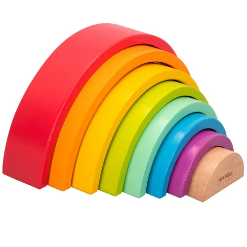 WOOMAX pedagogisk leksak i naturligt trä som består av 8 böjda delar av olika storlekar för att forma en regnbåge och oändliga andra strukturer.