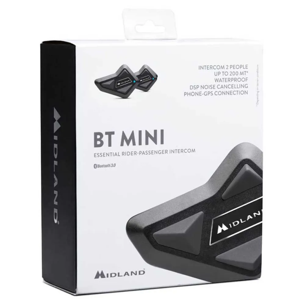 Bt Mini er den væsentlige pilot-passager Bluetooth-intercom med få funktioner til at svare på få væsentlige behov. Blandt dem holder man hjelmens overflade så smuk som den er. Bt Mini er kompatibel med alle de integrerede tilslutnings- og kontrolsystemer fra de største motorcykelfabrikanter (Bmw, Ktm, Ducati) og forbinder til GPS eller smartphone eller en anden Midland-intercom. Takket være sin lille størrelse er Bt Mini hurtig at installere, nem at konfigurere og holde hjelmlinjerne rene.
