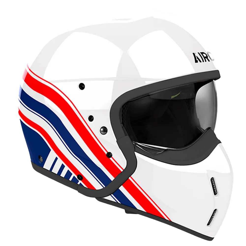 Der AIROH J110 Eon Modularhelm in Weiß/Rot/Blau ist ein stilvoller und vielseitiger Helm, der für Fahrer entwickelt wurde, die Sicherheit und Komfort priorisieren. Dieser Helm verfügt über ein modulares Design, das es den Fahrern ermöglicht, mit nur einem Knopfdruck einfach zwischen einer Vollvisier- und einer Jet-Konfiguration zu wechseln.