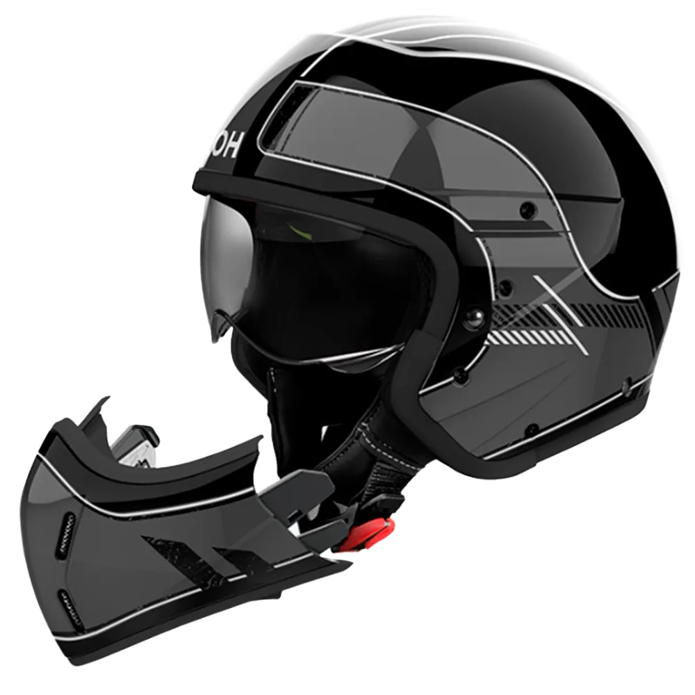 Der AIROH J110 Raster ist ein stylischer und vielseitiger Klapphelm, perfekt für Fahrer, die sowohl den Schutz eines Integralhelms als auch die Freiheit eines Jethelms genießen möchten. Dieses Modell kommt in einem eleganten und modernen Dunkelgrau Glänzend Finish, das Ihrer Motorradbekleidung einen Hauch von Raffinesse verleiht.