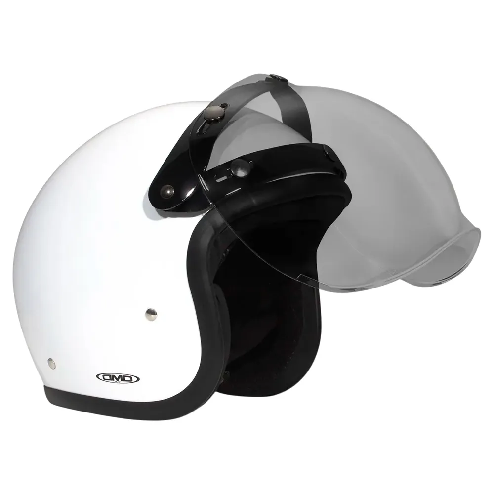 Das DMD Flip-Up Bubble Visier wurde für Vielseitigkeit entwickelt und verfügt über ein universelles Drei-Druckknopf-System, das es mit der gesamten Palette der DMD Jethelme und einer Vielzahl anderer Marken kompatibel macht, die diese Standardbefestigung verwenden. Die robusten Druckknöpfe gewährleisten eine sichere und stabile Verbindung zu Ihrem Helm, auch bei hohen Geschwindigkeiten, und geben Ihnen absolute Sicherheit. Erhältlich in einer Reihe von Tönungen, die zu Ihrem Stil und Ihren Fahrbedingungen passen – von kristallklar für perfekte Nachtsicht bis hin zu dunklem Rauch, um Blendung an hellen, sonnigen Tagen zu reduzieren – können Sie Ihr Setup für optimale Leistung und einen personalisierten Look anpassen. Jedes Visier ist für erhöhte Kratzfestigkeit behandelt, um dauerhafte Klarheit und Haltbarkeit für viele Kilometer Fahrspaß zu gewährleisten. Rüsten Sie Ihre Fahrt auf und erleben Sie die perfekte Mischung aus traditionellem Stil und innovativem Design mit dem DMD Flip-Up Bubble Visier.