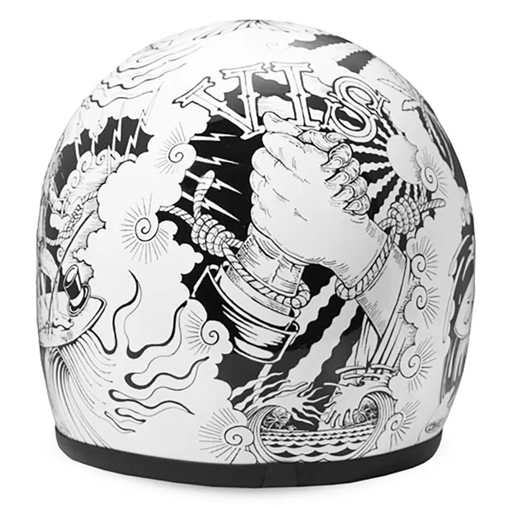 Das Erste, was auffällt, ist das unverwechselbare Retro-Design des Racer. Seine klaren Linien, die klassische Silhouette und die geräumige Augenöffnung sind eine direkte Anspielung auf seine 70er-Jahre-Herkunft. Diese weite Öffnung unterstreicht nicht nur den Vintage-Look, sondern bietet auch ein weites Sichtfeld und ist perfekt auf die Verwendung einer breiten Palette moderner Motorradbrillen für einen kompletten, authentischen Look ausgelegt. Der Helm verfügt außerdem über integrierte Druckknöpfe, die eine einfache Anbringung eines Schirms oder Visiers ermöglichen, um Ihren Stil weiter anzupassen und die Funktionalität zu erhöhen.