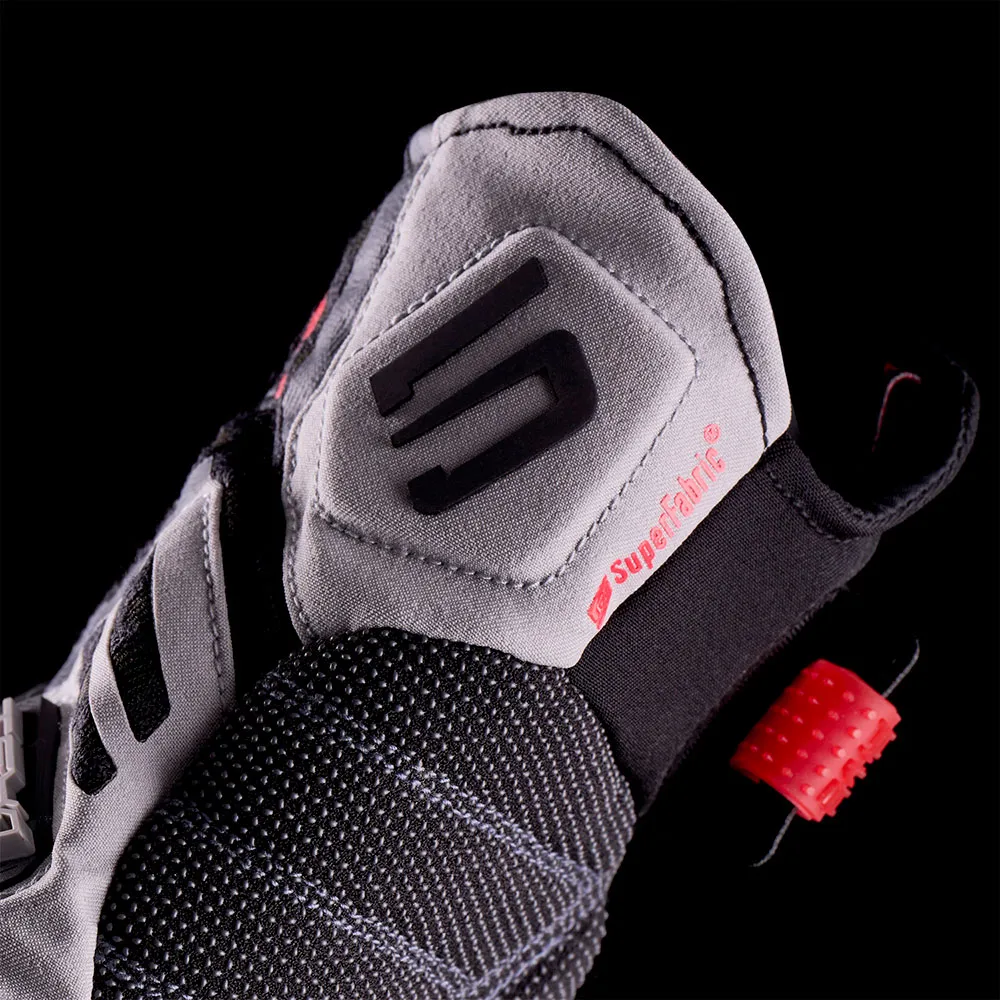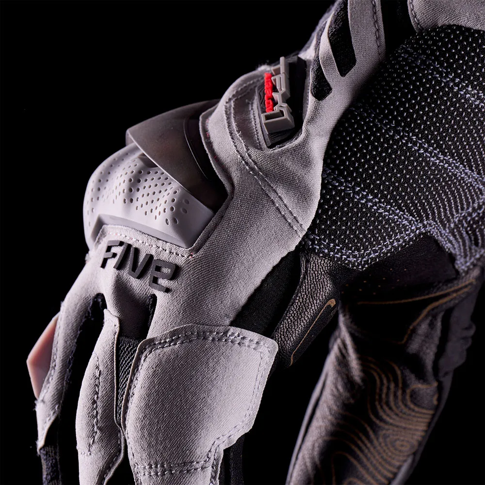 Die Elemente, aus denen die Finger des Handschuhs bestehen, sind mit halb-externen Nähten zusammengefügt, um das Gefühl von Komfort und Präzision bei der Bedienung zu verbessern. Und ein neues Komfortelement feiert in diesem Stil sein Debüt: VibraLess™ Anti-Vibrations-Pads (eine FIVE-Innovation) an Daumen und Handfläche, die darauf abzielen, Vibrationen zu absorbieren, die bei hoher Geschwindigkeit auf Offroad- oder unebenen Strecken (beschädigter Asphalt, Schotter, felsige Oberflächen usw.) auftreten.