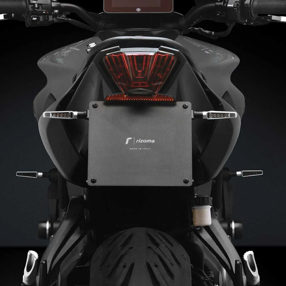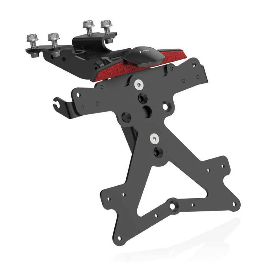 - Das Kit enthält einen 173x173 mm Kennzeichenhalter, einen 166x89.5 mm US-Kennzeichenhalter, OEM/Rizoma Blinkerhalterungen, SMD-LED-Kennzeichenbeleuchtung (homologiert) und Reflektor.