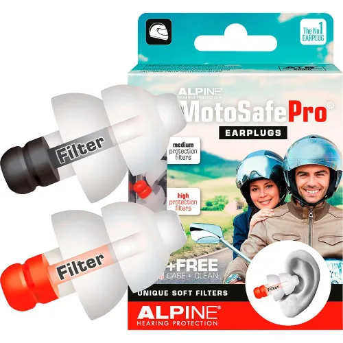 Alpine Motosafe Pro ear plug set Comfort &, Features:prevents hearing damage- traffic, navigation and motorbikes remain easily audbile no sense of closure perfect fit under the helmet thank to the AlpineThermoShapeTM material , fits in every ear no silicones reusable exquisite, spacious case including Alpine Clean cleaning spray in handy format