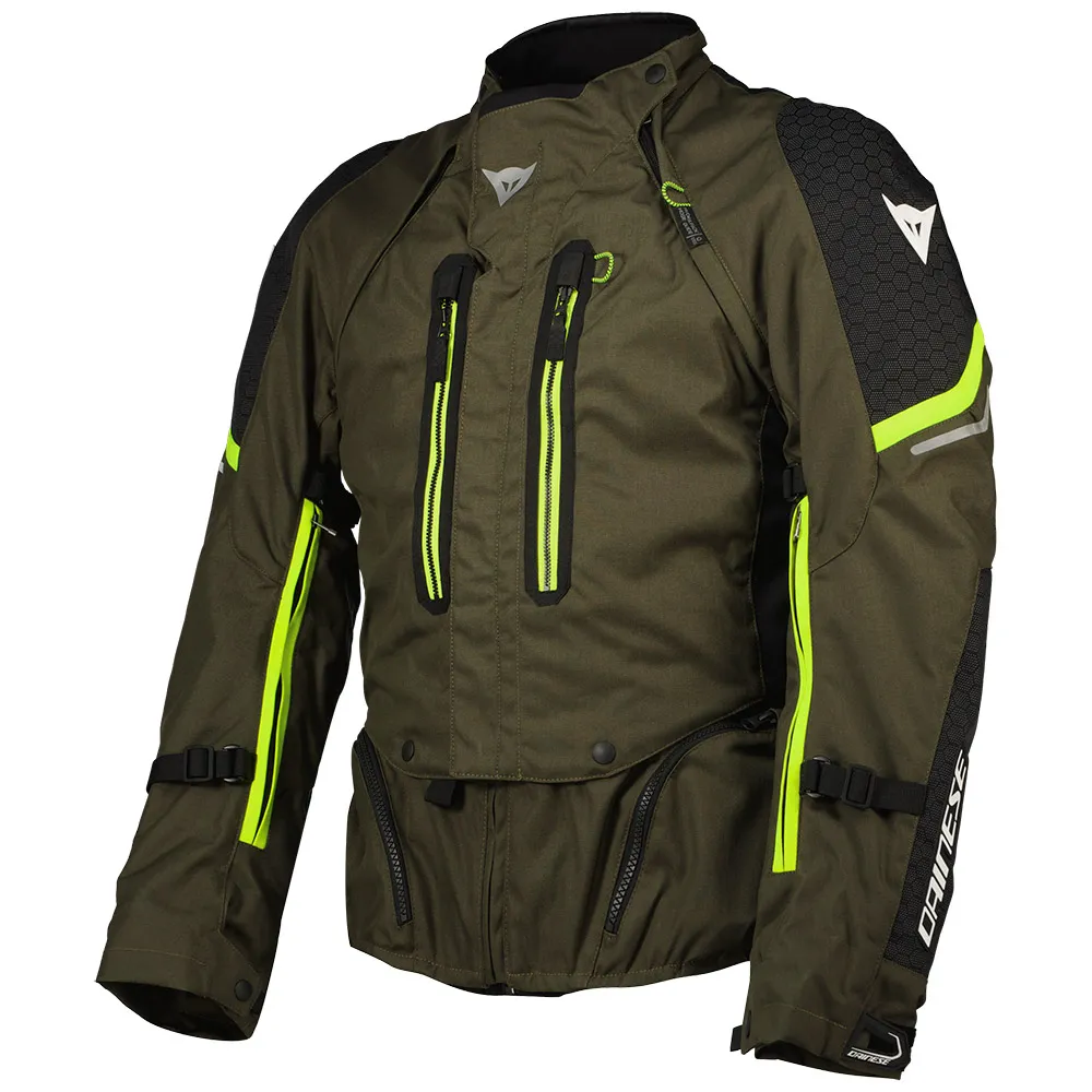 The DAINESE Super Adventure Absoluteshell™ jacket in Tarmac/Black/Fluo Yellow is designed for the adventurous motorcyclist who wants maximum protection and style. This men's jacket features a durable Absoluteshell™ construction with abrasion-resistant reinforcement panels for ultimate durability and safety.