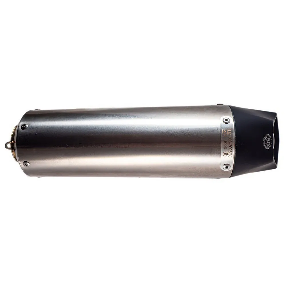 The exhaust has a removable dbkiller (noise restrictor) for racing use, remove the dbkiller is not ONLY illegal, but the customer assumes the responsibility to use the motorbike as on the circuits only, without bags, without flash light and number plate holder or other parts that would conflict with the different angle of the gas following the transformation into the racing version.