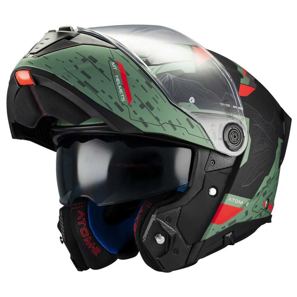Experience a revolution in long-distance riding with the MT Helmets Atom 2 SV. This state-of-the-art modular helmet delivers high-end solutions at a mid-range price, setting a new benchmark for flip-up helmets. Engineered to exceed ECE 22.06 and DOT safety standards, it offers superior protection and versatility. Key features include an extended retractable sun visor for complete coverage, a fast-opening shield with an anti-fog position, and a secure MT-Micrometric+ closure. The Atom 2 SV is the most complete and accessible all-rounder for the demanding rider