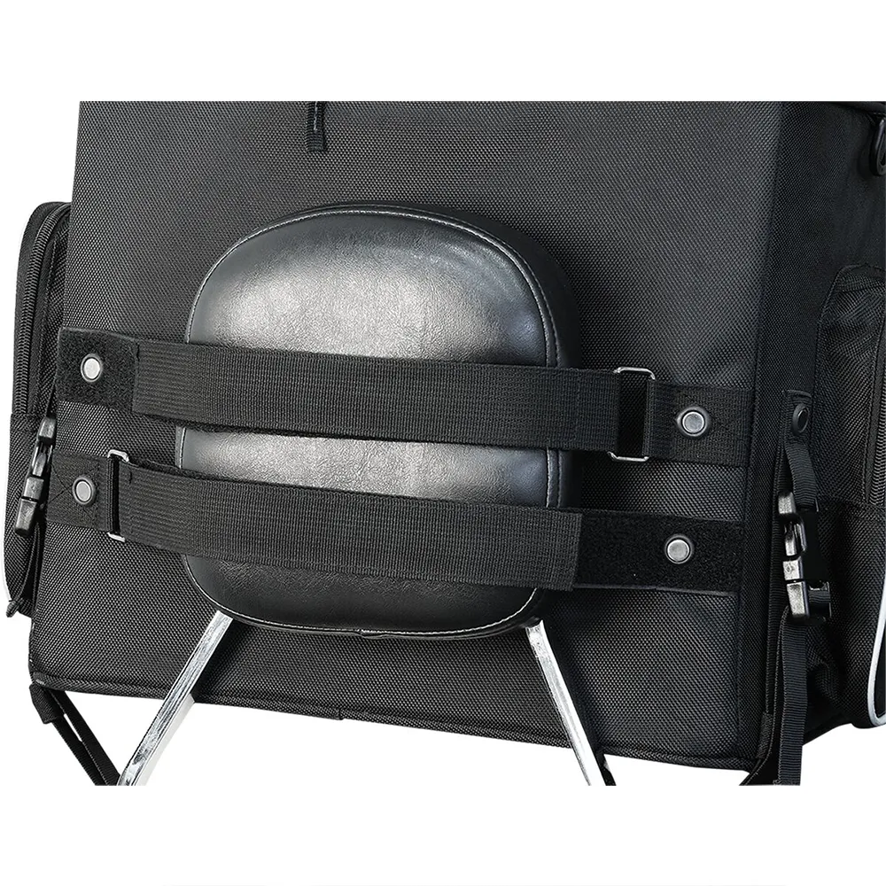 Mounts to luggage rack, Motorcyle backrest bar or passenger seat with quick release and self-fastening straps.