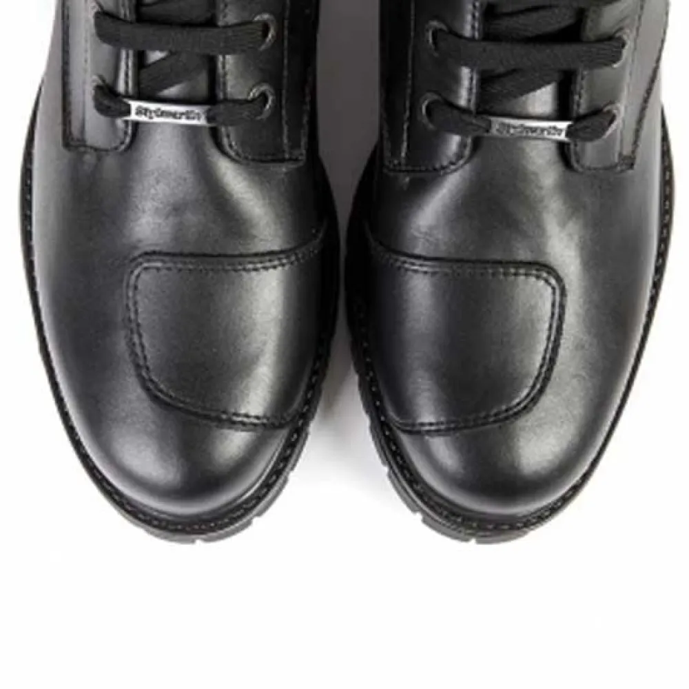 These stylish leather motorcycle boots feature high-quality construction with well-placed reinforcements and a functional gear shift pad. The design combines a classic lace-up look with a convenient side zipper for easy wear. These protective riding shoes have a pleasant style, but note that they tend to run large in size