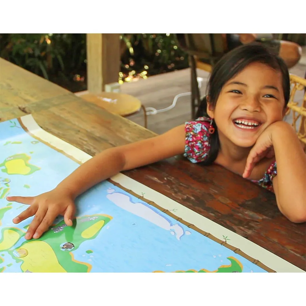 La mappa è adatta ai bambini di qualsiasi parte del mondo perché la base e gli adesivi non hanno nulla di scritto in nessuna lingua!