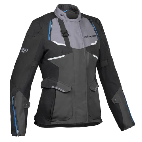 bretelle sul bicipite, bottoni al braccio, nastri elastici e cerniere con inserti per polsini, cinture in vita, nastri elastici interni in fondo alla giacca, chiusura al collo regolabile.