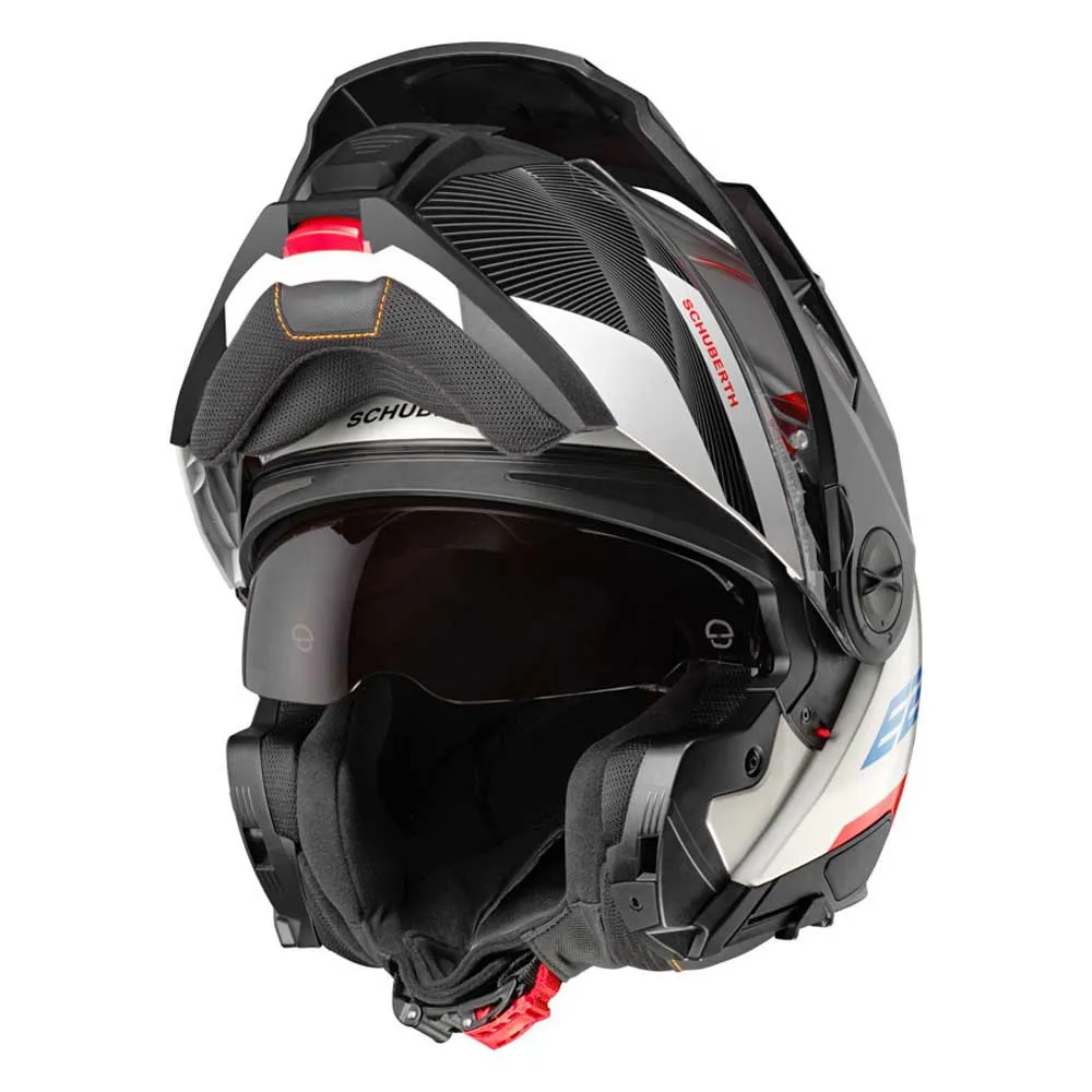 - Bij SCHUBERTH staat veiligheid centraal in elk product. De E2 is voorzien van de dubbele P/J-homologatie en voldoet aan de ECE-R 22.06-normen. De schaal van de SCHUBERTH E2 is gemaakt van glasvezel met SCHUBERTH's gepatenteerde DIRECT FIBER PROCESSING TECHNOLOGY en versterkt met koolstofvezel voor verbeterde schokabsorptie en lichter gewicht. Net als de hele SCHUBERTH-collectie, zijn de E2-voordelen van het Anti-Roll-Off-systeem verbonden met een kinband in een nieuwe geavanceerde positie voor meer comfort op het gebied van de keel.