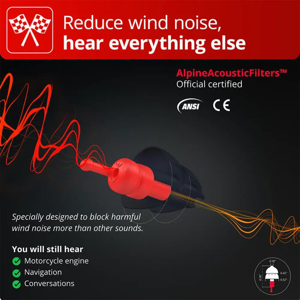 - Det du ønsker når du kjører motorsykkel, er å kose deg. Dessverre opplever mange motorsykkelførere en irriterende øresus og en følelse av utmattelse etter en lang tur. Dette er forårsaket av det svært høye støynivået vinden forårsaker under hjelmen. Alpine har designet spesialfilter ørepropper for motorsykkelførere. Alpine Motosafe Race lar deg ha livets tur.