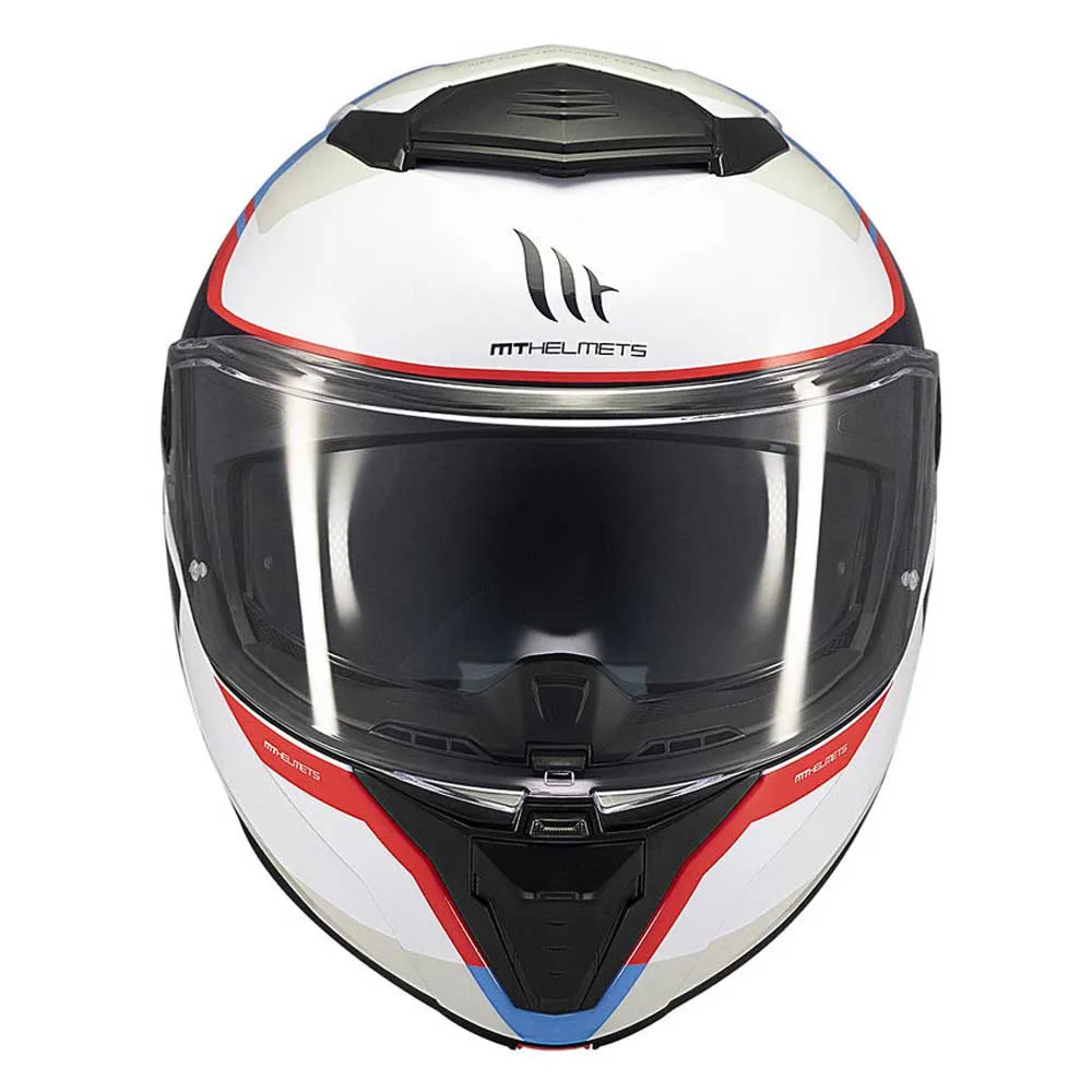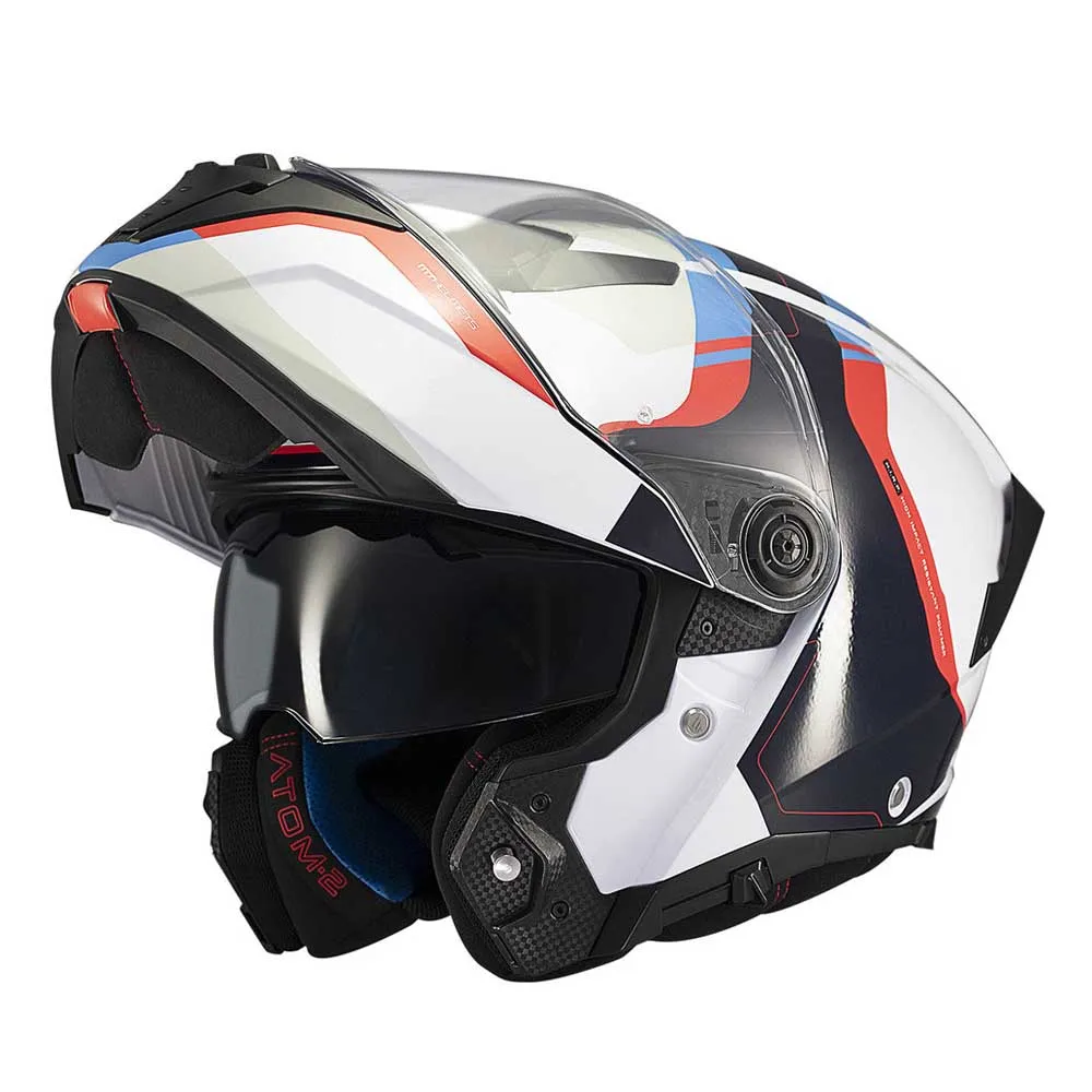 O capacete modular MT Helmets Atom 2 SV Emalla em Branco/Azul/Vermelho é um capacete versátil e elegante, projetado para motociclistas que priorizam segurança e conforto na estrada. Este capacete apresenta um design modular, permitindo que os motociclistas alternem facilmente entre uma configuração integral e aberta com o apertar de um botão.