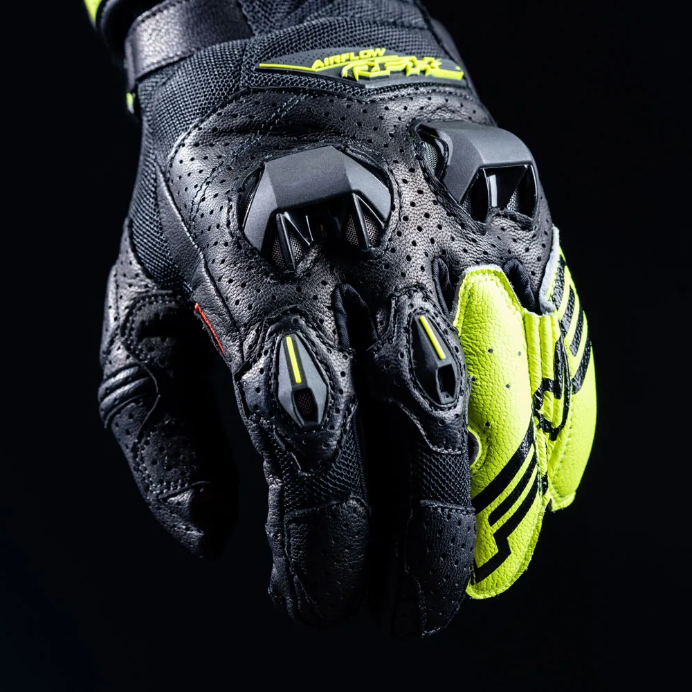 (ovansida) / getskinn (handflata), för extrem flexibilitet ventilerade TPU-skyddsskal för mellanhandsben och fingerleder mellanhandsförstärkningar i 5 mm tjockt skumgummi handflatsförstärkning i syntetiskt läder och silikontryck för grepp 3D-bikakemeshpaneler runt tummen samt pek- och långfingertopparna Kevlar® innerfoder på ovansidan av handen yttre fingersömmar (Gütermann-tråd) TPR-handflatesliderskal underarmsskyddsskal tillverkat av TPU (samma som rfx race) dubbelt stängningssystem med justeringsflik under skyddet skyddsflik anti-twist dragspelslänk mellan lillfingret och ringfingret för att begränsa risken att dras isär vid fall (en innovation från Five)