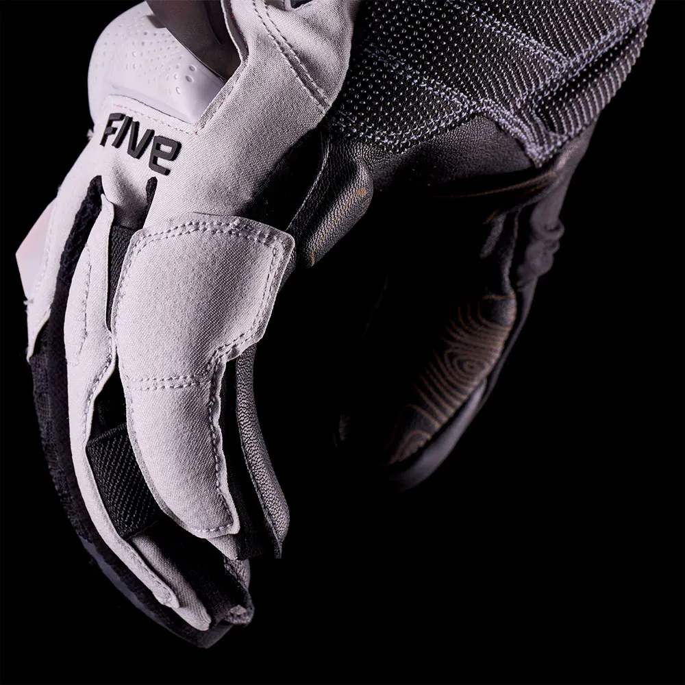 Elementen som utgör handskens fingrar är sammanfogade med semi-externa sömmar för att förbättra känslan av komfort och precision vid kontrollerna. Och ett nytt komfortelement gör sin debut i denna stil: VibraLess™ anti-vibrationskuddar (en FIVE-innovation) på tummen och handflatan, som syftar till att absorbera vibrationer som känns vid hög hastighet under terrängkörning eller på ojämna underlag (skadad asfalt, grus, steniga ytor, etc.).