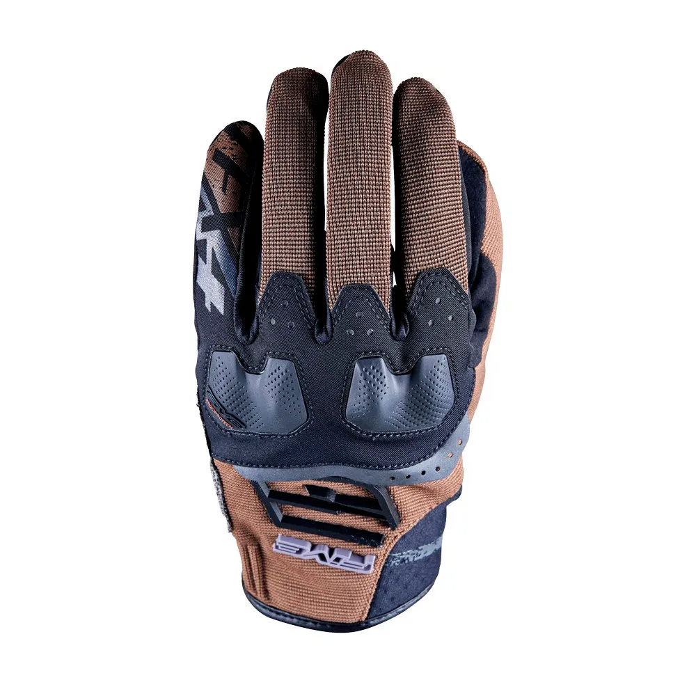 Kombinationsstruktur av vattenavvisande stretchtyg och 4-vägs Spandex™-tyg (ovansida), handflata i syntetiskt läder, ERGO PROTECH® dubbelt metakarpofalangealt skyddsskal i mjuk TPR, bred Kevlar®-förstärkning från handens bas till hypotenar, kardborreband och tummens bas i Airprene®-tyg som erbjuder både stöd och ventilation, Lycra®-liknande kilar (mellan fingrarna), Touch Screen™-system (pekfinger) för hantering av pekskärmar, halkfritt silikontryck på pek- och långfingrarna för bättre grepp om reglagen, retroreflekterande tygklaff på ovansidan av handen, FIVE soniska värmeförseglade logotyper fungerar som skydd