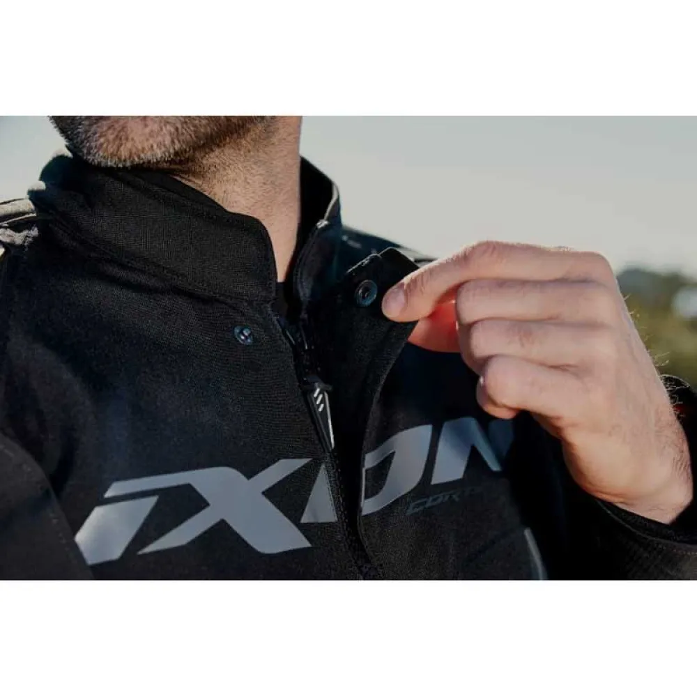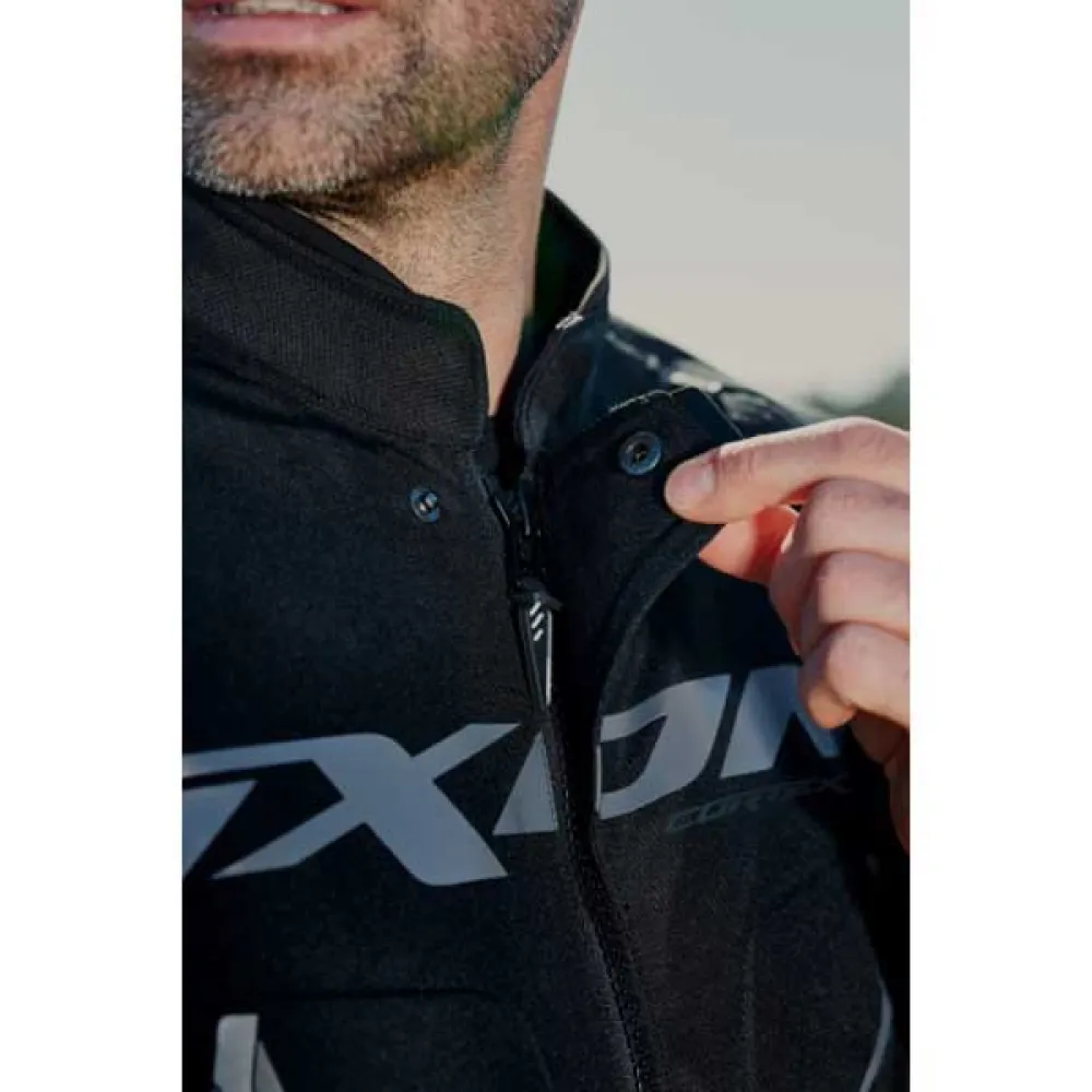 - Många detaljer hos CORTEX vittnar om designkvaliteten hos en jacka som verkligen är skapad för motorcykling. Vi kan nämna fliken med tryckknapp på kragen för att hålla fast fliken på den centrala stängningen, de laminerade materialförstärkningarna på armbågar och underarmar för optimalt skydd vid fall, eller den vattentäta plånboksfickan på insidan.
