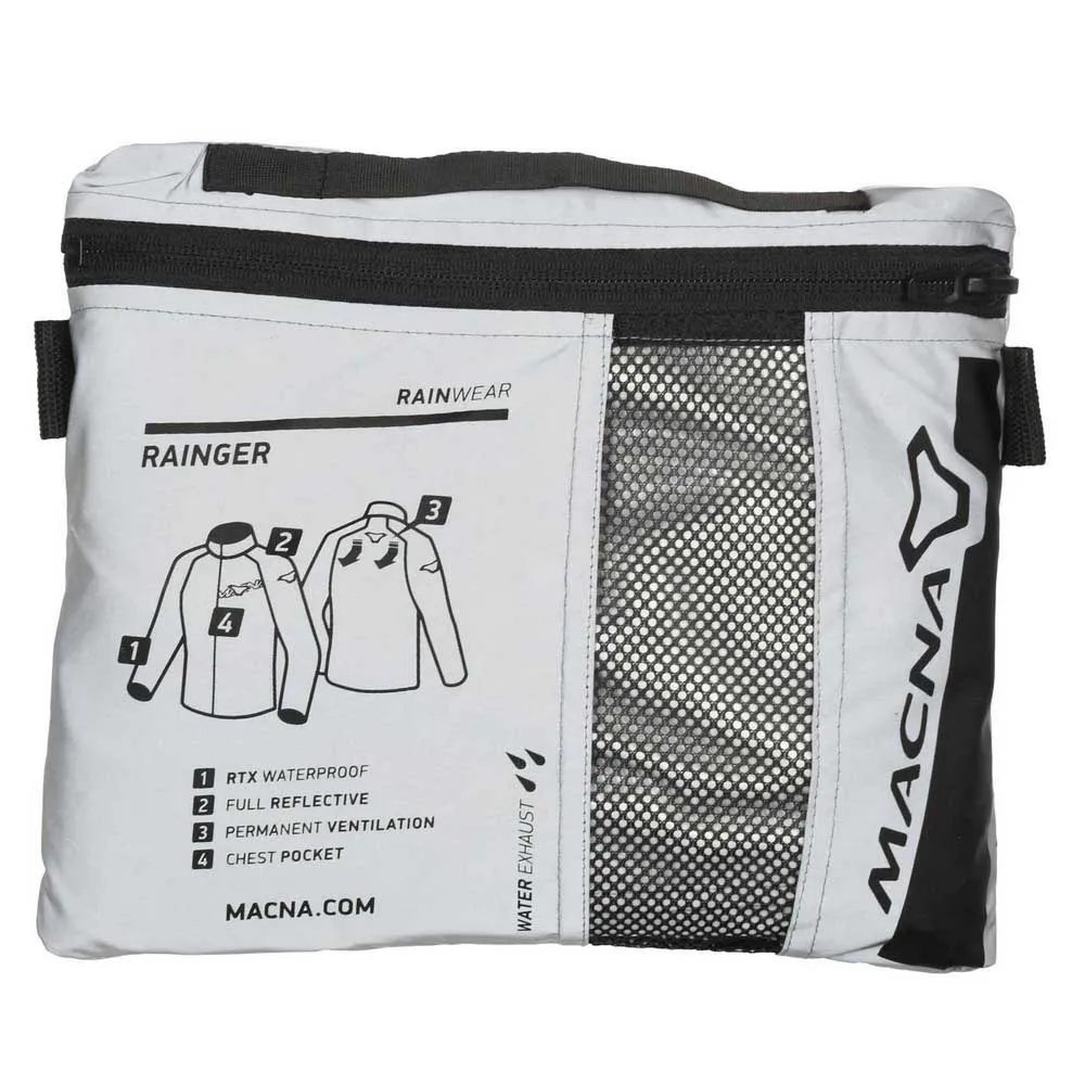 Designad med förarens upplevelse i åtanke är MACNA Rainger exceptionellt praktisk. Den levereras komplett med sin egen kompakta reseväska, vilket gör att jackan kan komprimeras till ett litet, lätt hanterbart paket. Denna genomtänkta design innebär att den tar minimalt med plats i din sadelväska, ryggsäck eller under sätet, vilket säkerställer att du alltid är beredd på en plötslig förändring i prognosen utan att offra värdefull förvaring.
