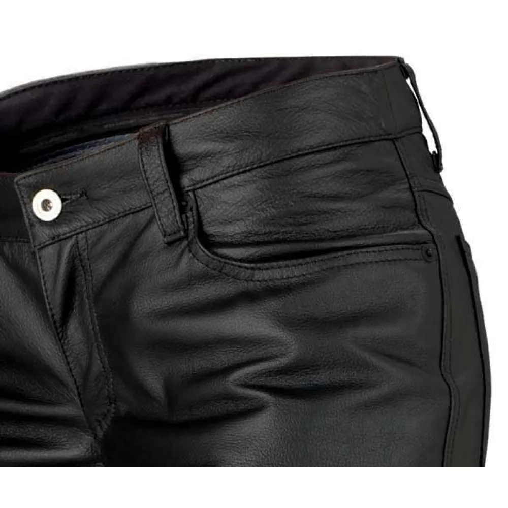 En klassisk 5-fickor byxor, gjorda av kohud läder med en 0,8 mm tjocklek.