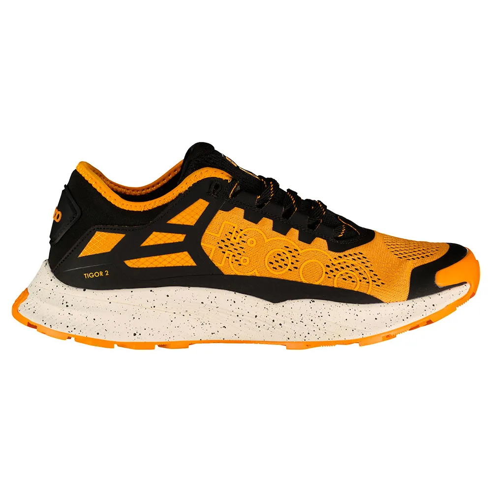 +8000 Tigor 2 24i trail løbesko er designet specifikt til mænd, der leder efter højtydende sko til at tackle ujævnt og krævende terræn. Disse sko har en levende orange og sort farvekombination, hvilket giver dem et dristigt og iøjnefaldende look.