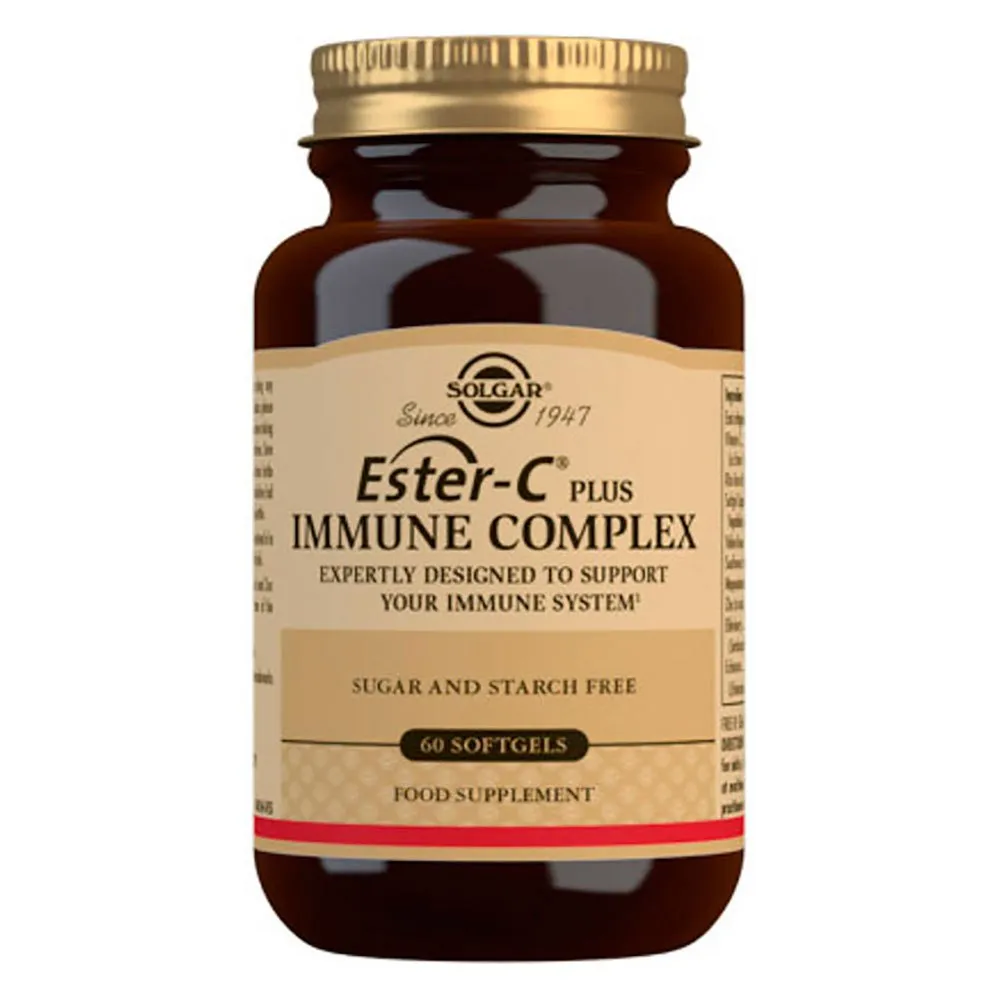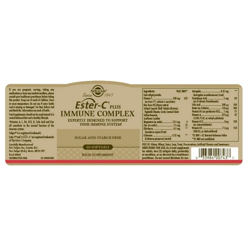 Ester C® Plus Immune Complex indeholder videnskabeligt undersøgt immunsystem, der understøtter næringsstoffer og er designet til at opretholde immunsystemets funktion hele året. & Denne omfattende formel er lavet med vitamin A, B6, B12, C og D3 samt folat og zink. Det giver også botaniske ingredienser hyldebær, echinacea og astragalus. Disse botaniske stoffer, der har en lang historie med brug. Ester C® er udelukkende formuleret til Solgar® og giver et grundigt undersøgt, ikke-surt C-vitamin, der er skånsomt for maven. Når Ester er taget, opbevares det i hvide blodlegemer i op til 24 timer - det er dobbelt så længe som standard ascorbinsyre. D-vitamin kaldes ofte ”solskins-vitaminet” og produceres ved interaktion af sollys på huden. D-vitamin er et fedtopløseligt vitamin og understøtter ikke kun immunsystemets sundhed, men er også nødvendigt for sunde knogler og tænder. Når soleksponering er begrænset, er vitamin D-niveauer muligvis ikke tilstrækkelige. Zink understøtter flere aspekter af immunforsvaret. Det sikrer normal udvikling og funktion af immunceller og ved at støtte hudbarrieren. Huden beskytter mod fremmede angribere, der kommer ind i kroppen.& Solgar® Ester C® Plus Immun Complex giver langvarig immunforsvar hver dag med 1000 mg Ester C®; vist sig at forblive i immunceller i op til fireogtyve timer. A-vitamin bidrager til immunsystemets normale funktion Vitamin B6 bidrager til immunsystemets normale funktion C-vitamin bidrager til immunsystemets normale funktion D-vitamin bidrager til den normale funktion af immunsystemet hos børn. D-vitamin bidrager til immunsystemets normale funktion Normal funktion af immunsystemet og betændelsesrespons Folat bidrager til immunsystemets normale funktion Zink bidrager til immunsystemets normale funktion