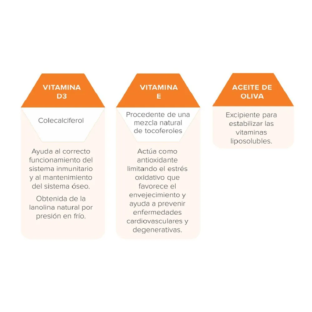Dens eksklusive formulering med antioxidanter forhindrer dens oxidation ved at præsentere en dosering på 1000 IE/dråbe, hvilket gør det nemt at justere doseringen i henhold til de anbefalede doser for hver befolkningsgruppe.