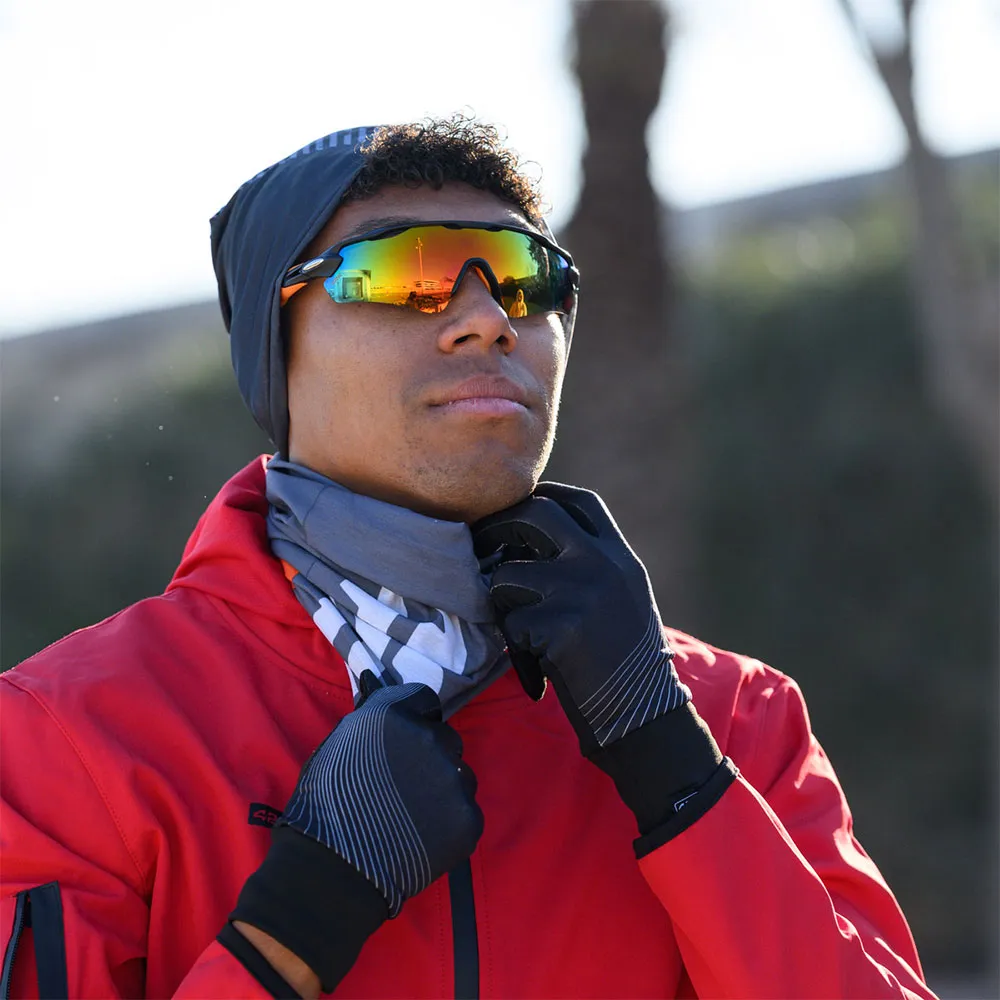 Touchscreen-Laufhandschuhe. 100 % recyceltes Polyester-Funktionsgewebe. Spezielles Material an Daumen und Zeigefinger für die Bedienung von Touchscreens. Innenfutter aus Mikrofleece. Wirkungsbereich von +5 °C bis -5 °C. Stretchgewebe für perfekte Passform. 2 Größen: S/M (22x8.5 cm) und L/XL (24x9.5 cm). Doppelt geschichteter, verstellbarer Bund. Vorderseite mit sublimiertem Design und Rückseite in Schwarz. Aufgenähtes 42K-Etikett.