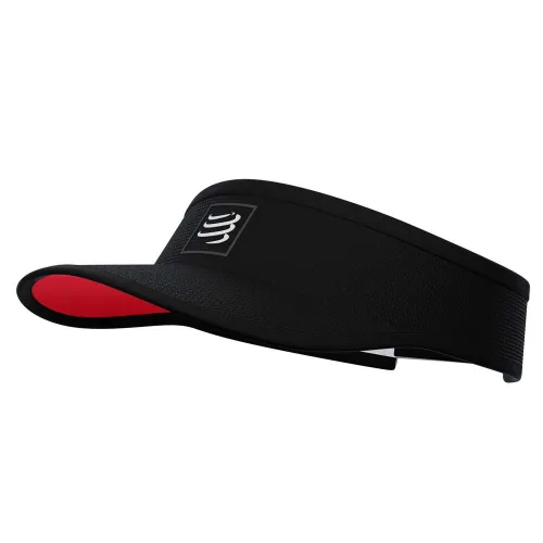 Rot-schwarzes Laufvisier, gut belüftet, schützt vor Sonnenstrahlen und mit schnell trocknenden Fasern.