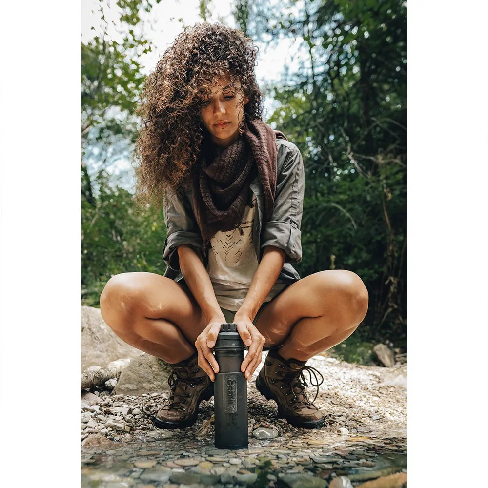 Mit der UltraPress Wasserfilterflasche können Sie selbst das schmutzigste Wasser im Handumdrehen in sauberes Trinkwasser verwandeln, egal wo Sie sich auf der Welt befinden. Der „kleine Bruder“ des GeoPress hat ein Fassungsvermögen von 500 ml, verfügt über einen faltbaren Griff am Deckel und filtert in nur 10 Sekunden (3 l/min). UltraPress und GeoPress arbeiten nach dem gleichen schnellen und effektiven Prinzip: Wasser wird in den Behälter gefüllt, der Flaschenkopf mit Filter wird eingesetzt, nach unten gedrückt und schon können Sie reines Trinkwasser genießen. Viren, Bakterien, Pestizide, Chemikalien, Schwermetalle, Mikroplastik usw. werden sicher aus dem Wasser gefiltert. Diese einfache und schnelle Bedienung macht das lange Kochen von Wasser überflüssig und macht den UltraPress nicht nur zum perfekten Begleiter für Outdoor- und Trekkingtouren, sondern auch zu einem sinnvollen Kauf für den Urlaub oder für Notfälle zu Hause. Außerdem ist die BPA-freie Flasche extrem robust und kann auch bei gefülltem Zustand Stürze aus drei Metern Höhe auf Beton überstehen. Robuste Wasserfilterflasche mit 500 ml Fassungsvermögen. Reiniges, gereinigtes Trinkwasser in 10 Sekunden (3 l/min). OnePress™ Global Protection ermöglicht es Reisenden, Abenteurern und Überlebenskünstlern, sauberes Trinkwasser aus den fragwürdigsten Wasserquellen der Welt zu erhalten. Entfernt wassergebundene Krankheitserreger (99,99 % der Viren, 99,9999 % der Bakterien, 99,9 % der Protozoenzysten), einschließlich Rotavirus, Hepatitis A, Norovirus, Giardiasis, Cryptosporidium, E. coli, Cholera, Salmonellen, Ruhr und mehr. Ultrafein gepulverter Aktivkohlefilter filtert Partikel (Sediment, Mikroplastik) und adsorbiert viele Chemikalien, Pestizide, Herbizide, Schwermetalle, VOCs, Aromen und Gerüche. Austauschbare Filterpatrone für 300 Zyklen (40 gal. / 150 L). Der RiverFlow™-Auslauf liefert einen schnellen Durchfluss von sauberem Trinkwasser zum Trinken, zum Befüllen von Trinkbehältern und anderen Flaschen. 90° drehbarer FlipCarry™-Griff für mühelose Trennung (Inner Press von Outer ReFill) und einfaches Tragen. bietet in flacher Position eine große Pressfläche. Der multifunktionale SimpleVent™-Trinkauslauf entlüftet Luft während der Reinigung und Filtration (durch eine halbe Drehung des Deckels). schützt den Auslauf vor Kreuzkontamination. Ergonomisches SoftPress™-Komfortpolster (am Trinkdeckel) sorgt für rutschfestes, ermüdungsfreies Drücken.