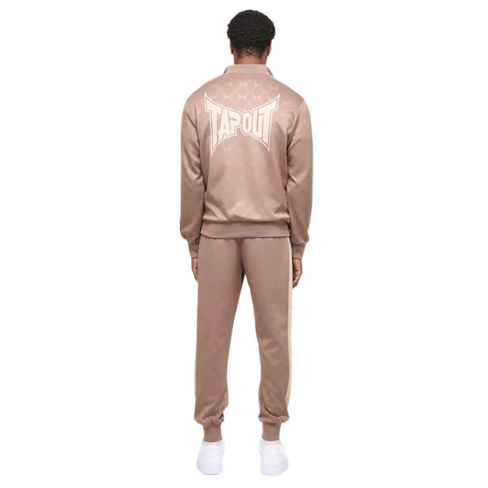 Tracksuit with contrasting details such as 3D rubber badges and contrasting inserts on the shoulders, sleeves and trouser legs. There are zip pockets on both the jacket and trousers. The entire fabric has been embossed so that the Tapout brand logo is visible everywhere. The back is adorned with a large print.