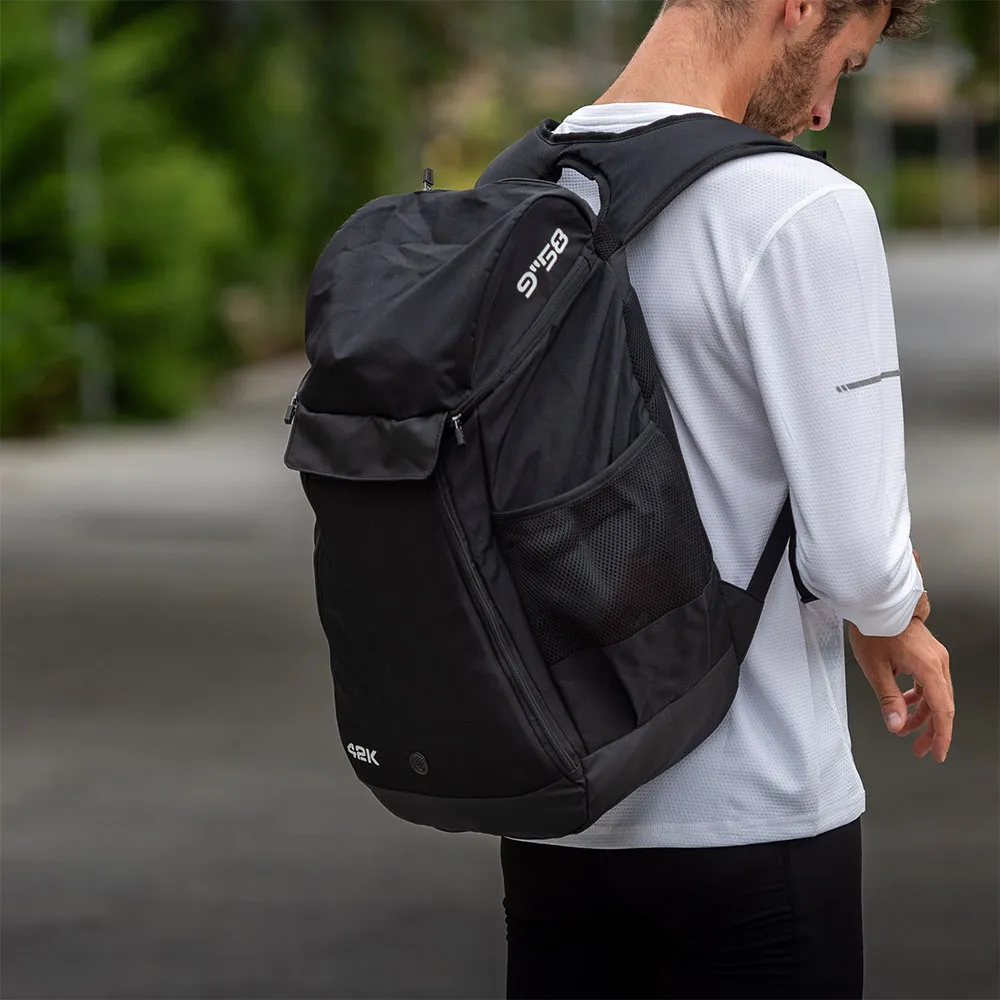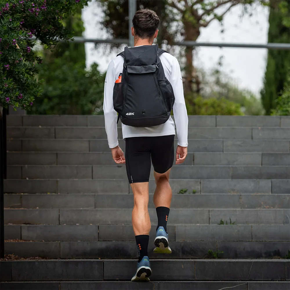 Ergonomically designed sports backpack for running. Capacity: 30 litres. Weight: 500 grams. Composition: 100% polyester. Measurements: height 49 cm, width 31 cm, depth 20 cm. Easy access to the interior contents thanks to its wide-opening design. Interior compartment for shoes. Large capacity inner pocket. Exterior top pocket with zip. Reinforced and padded shoulder straps with 3D mesh Mesh fabric. Handle incorporated in the shoulder straps. Adjustable and adjustable chest strap. Back padded with 3D Mesh back padding. 3 zips with safety pullers. 2 3D Mesh fabric pockets on sides for bottles. High abrasion resistant materials, linings and stitching. Breather for shoe storage area. Matching gymbag inside. Space for identification card. Exclusive packaging with reusable bag with zip-lock closure system.