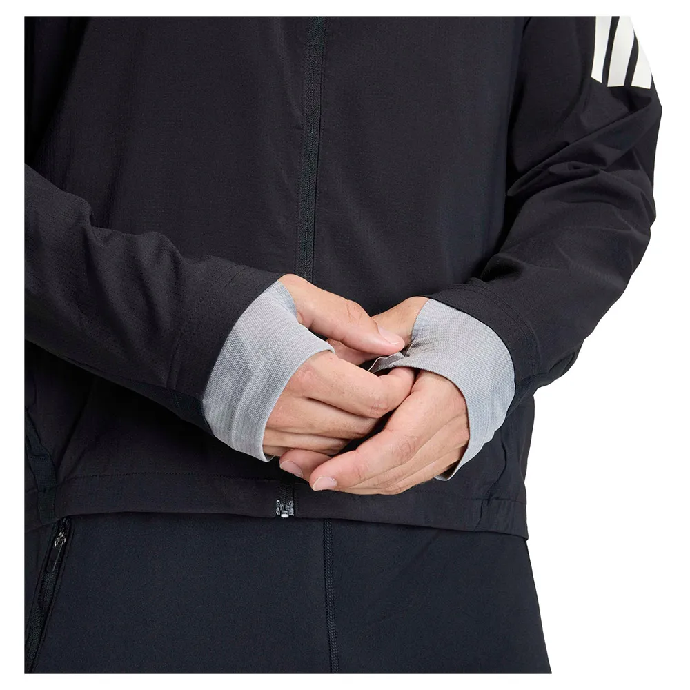 Running jacket with mesh inserts for breathability.